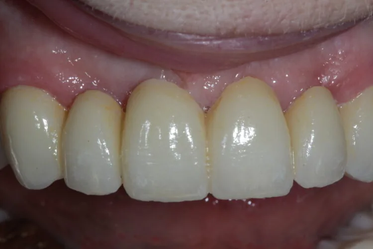 4. After this phase, a definitive six-unit porcelain bridge was placed to restore aesthetics and function.