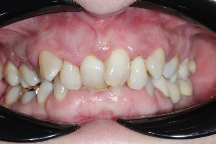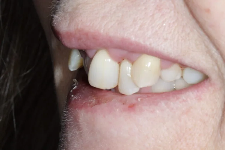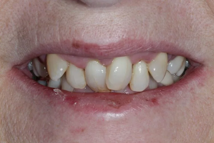 A woman in her mid-50s presented with the desire to improve her smile. She had not attended dental appointments for several years and felt ashamed of her teeth due to longstanding neglect. At the time of presentation, she had significant periodontal deterioration, particularly involving the upper four anterior teeth, which exhibited bone loss and mobility. Although she initially requested orthodontic treatment, this was not viable due to the advanced periodontal condition